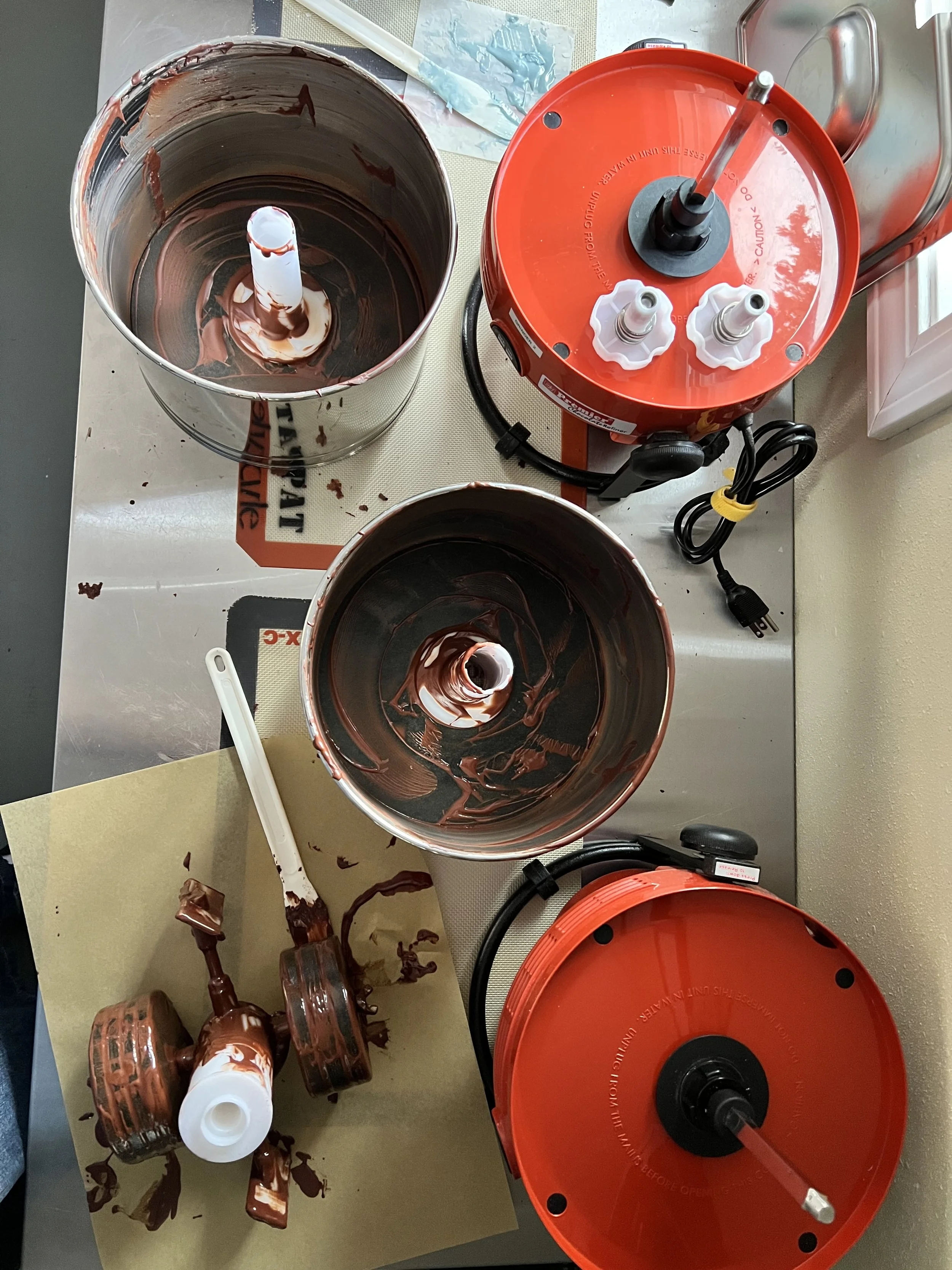 Tempering is where flavor, texture, and shine converge. By precisely heating and cooling the chocolate, I align the cocoa butter into its most stable form type V crystals locking in flavor and giving each bar that glossy finish and crisp, satisfying snap.